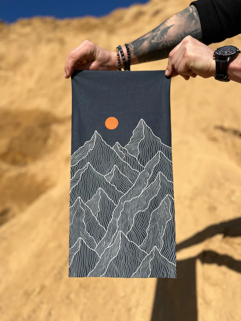 W Twoim outdoorowym ekwipunku są rzeczy, które zabierasz „na wszelki wypadek”, i takie, bez których nie ruszasz się z domu. Ten komin w góry zdecydowanie należy do tej drugiej grupy. Jeśli znasz już naszą koszulkę techniczną, ręcznik czy plakat z serii „W Góry!”, na pewno wiesz, że za tą grafiką stoi coś więcej niż tylko estetyka. Minimalistyczny motyw gór i słońca to autorskie dzieło naszej zaprzyjaźnionej ilustratorki. Stworzyliśmy go z myślą o osobach, które nie przepadają za pstrokatymi wzorami, a na szlaku cenią sobie jakość i komfort. Ta chusta wielofunkcyjna w góry to ukłon w stronę miłośników wędrówek i minimalizmu – jej siła tkwi w uniwersalności: świetnie sprawdzi się założona tradycyjnie na szyję, ale równie dobrze zastąpi czapkę lub opaskę, warto ją nosić pod kaskiem górskim, rowerowym czy rolkowym.