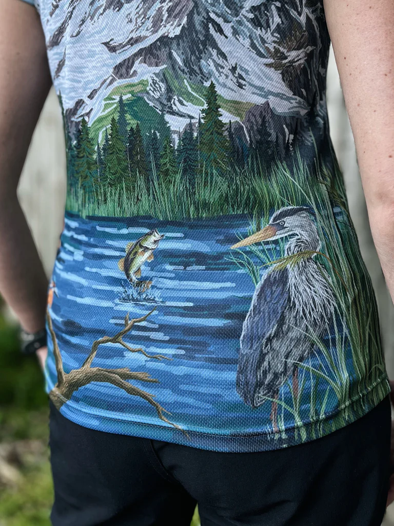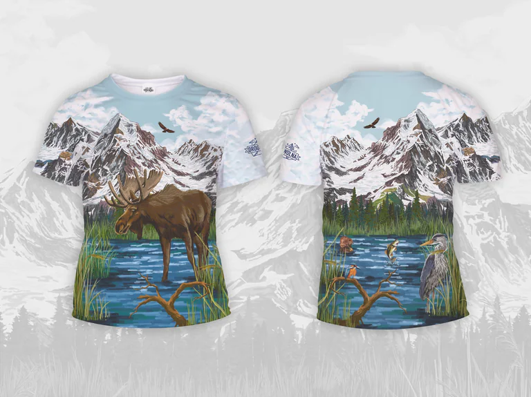 Już na pierwszy rzut oka urzeka niepowtarzalna ilustracja, która została stworzona z wielką pasją specjalnie dla nas. Jeśli więc poszukujesz koszulki z motywem łosia, która wyróżni Cię na każdym szlaku i podczas każdej aktywności, to właśnie ją znalazłaś. Tył koszulki zdobią równie ważni bohaterowie: relaksujący się na kamieniu bóbr, odpoczywający na gałęzi zimorodek, tańcząca w powietrzu ryba i dostojna czapla brodzącą w strumieniu. Te wszystkie detale to bardzo ważne smaczki, które opowiadają piękną historię o harmonii przyrody, którą możesz mieć zawsze przy sobie.