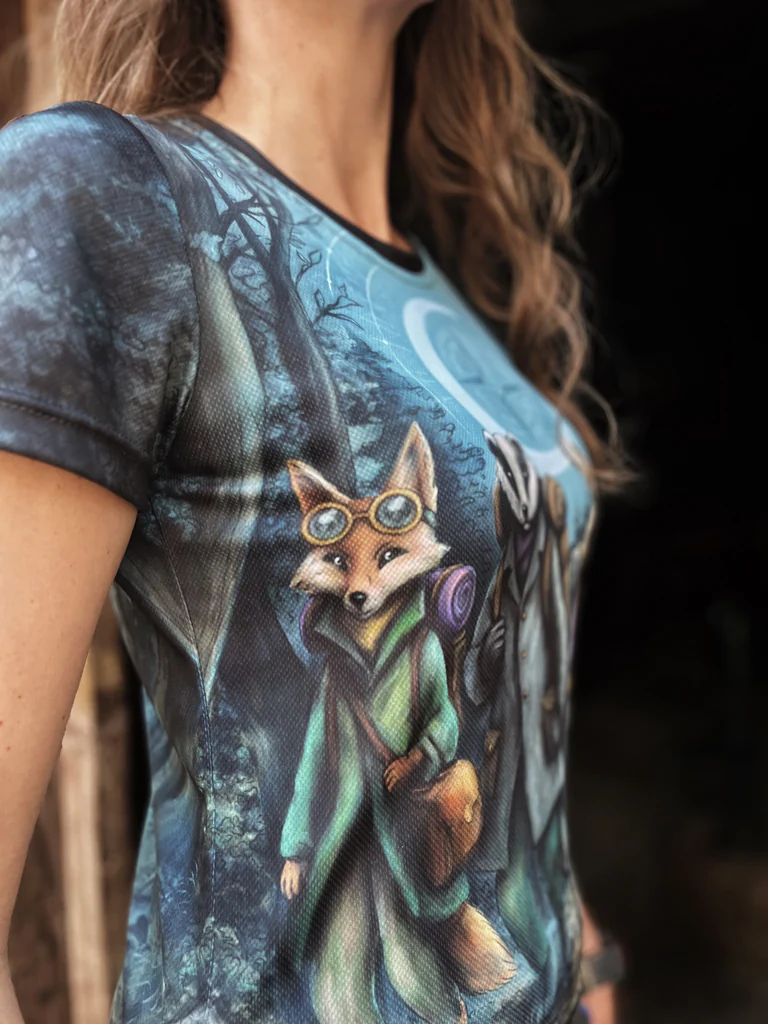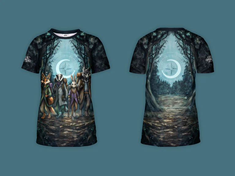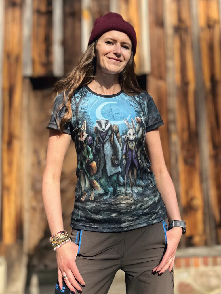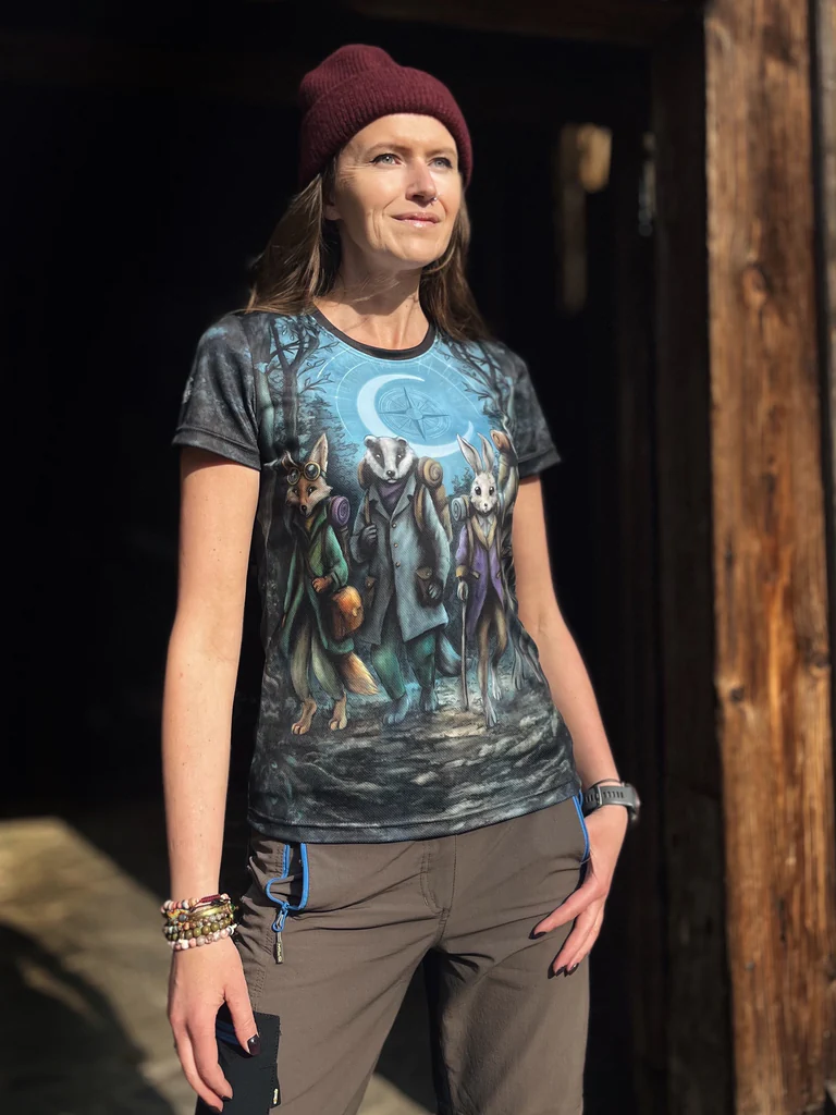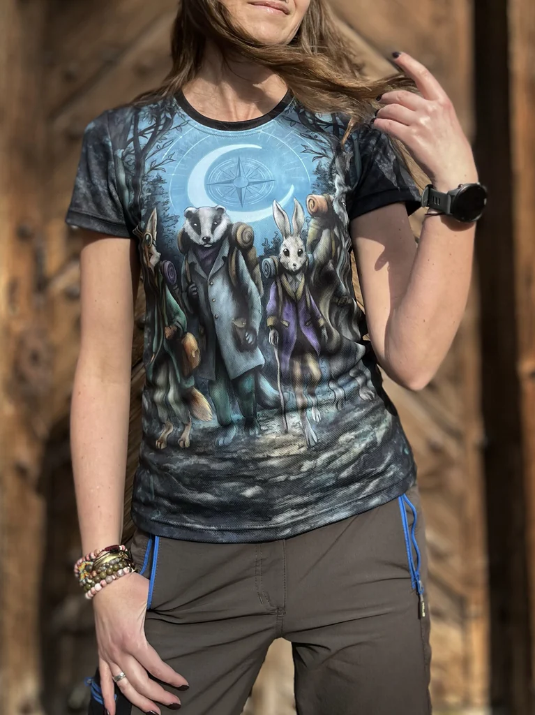 To zgrana czwórka, która w nocy, pod osłoną księżyca, z plecakami i torbami, szykuje się do wielkiej wyprawy. Nad nimi świeci księżyc i róża wiatrów, która ma pomagać w nawigacji. Ta grafika, inspirowana stylem baśniowym, gdzie zwierzęta są uosobione, to propozycja dla miłośników wędrówek, lasu i przygód. To idealna koszulka z motywem baśni dla tych, którzy nie boją się nocy i wierzą, że najciekawsze rzeczy dzieją się poza utartym szlakiem.