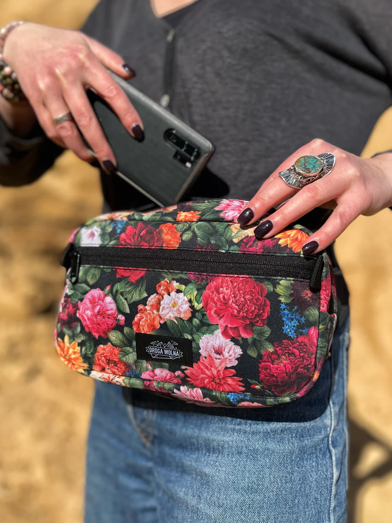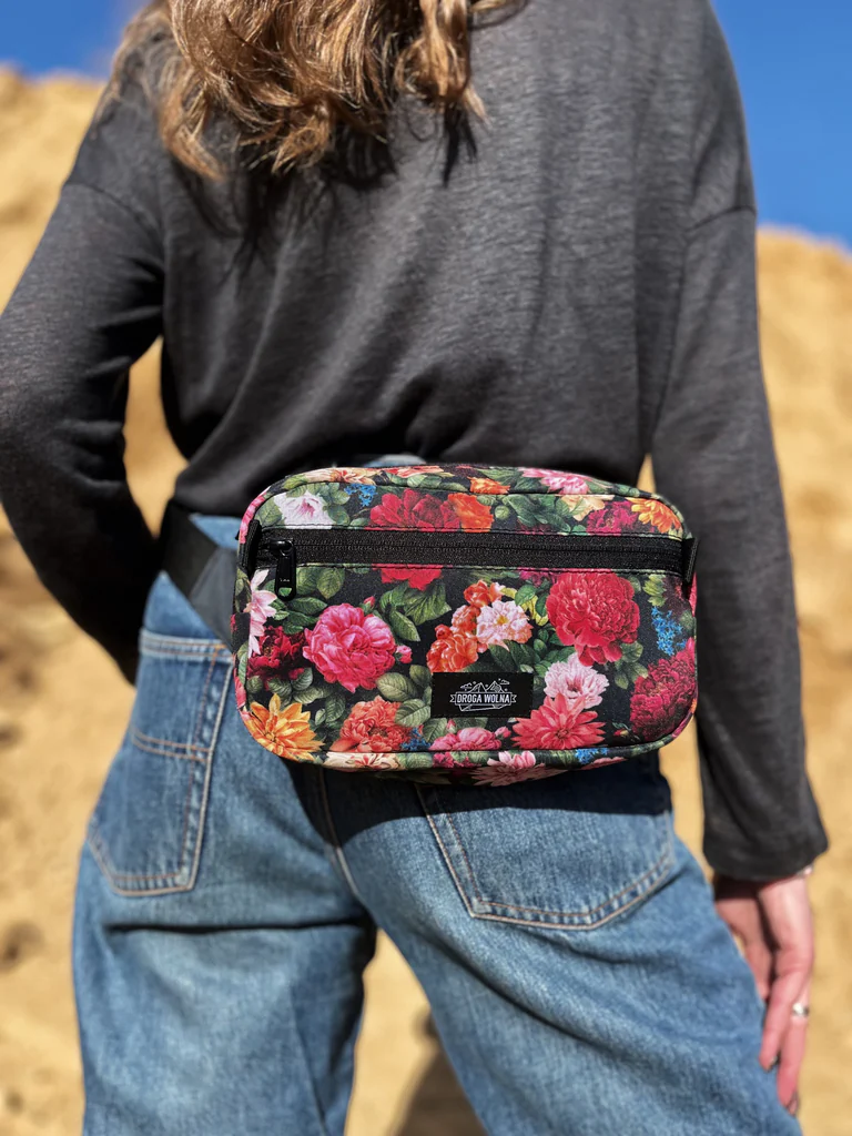 Dzięki regulowanemu paskowi możesz ją nosić tak, jak lubisz: klasycznie w pasie lub zawieszoną przez ramię (crossbody). Ta elastyczność sprawia, że nerka w kwiaty staje się niezastąpionym kompanem przygód – od porannego spaceru z psem, przez zakupy na targu, aż po wieczorne ognisko w górach. To idealne rozwiązanie dla kobiet, które żyją aktywnie i kochają naturę.