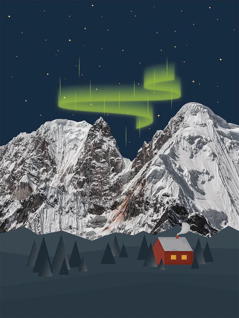 Jest to jak zawsze autorska grafika, stworzona specjalnie dla nas przez zdolną ilustratorkę. Przedstawia ośnieżone szczyty i zorzę w sposób, który od razu przenosi myśli w stronę mroźnych, ale fascynujących wypraw. Projekt powstał dla miłośników dobrego designu i gór. Do tej pory ta grafika była na naszej koszulce termoaktywnej, teraz może być w Twoim domu, ozdabiając wnętrze i przypominając o pasji. To idealny plakat górski dla tych, którzy kochają surowy klimat zimy i niesamowite zjawiska świetlne nad wierzchołkami.
